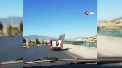 - Kahramanmaraş’ta trafikte dengesiz yük ile seyir halinde olan kamyonetin tehlikeli yolculuğu korkulu anlara neden oldu. Kahramanmaraş kuzey çevre yolunda trafikte seyir halinde olan bir kamyonun kasasına aşırı yüklenen malzemeler adeta kazaya davetiye çıkarttı. Seyir halinde olan ve kasasında demir ve çeşitli ev aletlerinin yüklü olduğu kamyonet hem hızlı hem de tehlikeli seyri dikkat çekti. Kamyonun kasasında bulunan yüklerin her an devrilecek gibi durması trafikteki diğer sürücülerin panik olmasına yol açarken, tehlikeli yolculuk anı ise aynı istikamete giden başka bir aracın sürücüsü tarafından cep telefonu kamerasıyla saniye saniye kaydedildi.