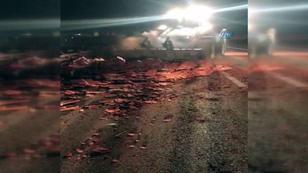 Tuğla yüklü tır devrildi...Tuğlalar yola saçıldı