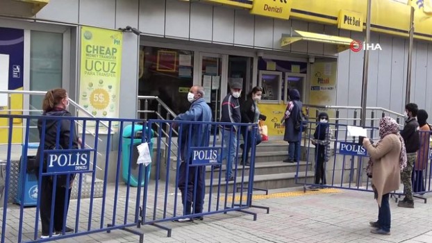 - Denizli’de 3 günlük sokağa çıkma kısıtlamasının ardından vatandaşlar sokağa çıktı. Caddelerde ve kent meydanındaki yoğunluğun yanı sıra, postane ve bankalarda uzun kuyruklar oluştu. Denizli’de 3 günlük sokağa çıkma kısıtlamasının ardından vatandaşlar sokaklara döküldü. Vatandaşlar banka ve postane işlemleri için sıraya girerken, güneşin açması ile caddelerde gezenler sosyal mesafe kurallarına kimi zaman uydu, kimi zaman ise kurallara uymayarak sohbet etti. Postanede metrelerce insan kuyruğu oluştu Kent’in meydanında bulunan postanede, vatandaşlar kişisel işlemlerinden dolayı insan kuyrukları oluşturdular. E-Devlet şifresi alabilmek için sabahın erken saatlerinde postane kuyruğuna girdiğini dile getiren Ahmet Ali Kara, “Sabah 8.40'da geldim postaneye. E devlet şifresi almak için. O saatten beri de bekliyoruz. İki saati aşkın süredir bekliyorum” dedi.