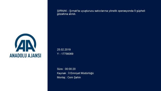 - Uyuşturucu operasyonu - Şüpheliye kelepçe takılması Şırnak 'ta uyuşturucu operasyonu: 5 gözaltıŞIRNAK (AA) - Şırnak 'ta uyuşturucu satıcılarına yönelik operasyonda 5 şüpheli gözaltına alındı.Emniyet Müdürlüğü Narkotik Şubesi ekiplerince okul önlerinde uyuşturucu satışı yapanlara yönelik 117 kişilik ekiple operasyon düzenlendi.