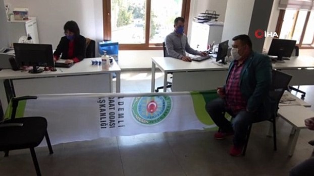 - Mersin'in Erdemli ilçesinde 15 bin üyesi bulunan Erdemli Ziraat Odası'nda korona virüs önlemleri üst düzeyde tutuluyor. Odaya başvuru için gelen çiftçilerin elleri dezenfekte ediliyor, ateşleri ölçülüyor, maskesiz olanlara maske veriliyor. İşlemler esnasında sosyal mesafe kuralları uygulanıyor.Üretimin devamlılığı için çaba saf eden çiftçiler, yasal başvurular ve diğer işlemlerini ziraat odaları aracılığı ile sürdürüyor. Erdemli Ziraat Odası, işlemlerin yürütülmesi esnasında korona virüse karşı bir dizi önlem aldı. Odada sosyal mesafe kurallarına uyulurken, ziyaretçilerin elleri dezenfekte ediliyor, ateşleri ölçülüyor ve maskesi olmayanlara maske veriliyor.Odaya ürün tonajı bildirimi için geldiğini ifade eden bazı üreticiler, uygulamalardan memnun olduklarını söylediler. Üretici Durmuş Ali Türer, "Ürün tonajı bildirmeye gelmiştim. Burada ateşimizi ölçtüler, dezenfektemizi yaptılar. Sosyal mesafeyi koruyoruz. Kendi sağlığımız için, herkesin sağlığı için kurallara uyuyoruz" dedi.