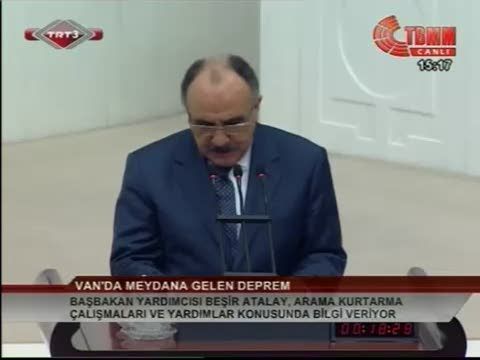 Başbakan Yardımcısı Beşir Atalay, Van'da yaptığı çalışmalar sonrası TBMM'de milletvekillerine yaşanan depreme ilişkin bilgi verdi. Atalay, Van depreminin saati ve şiddeti hakkında kısa bir bilgi verdikten sonra can kayıplarına ilişkin son gelişmeleri aktardı. Atalay, ''370 kişi hayatını kaybetti, 1300 kişi de yaralandı'' dedi.