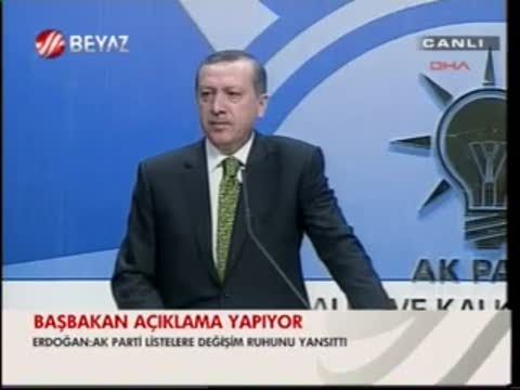 AK Parti Genel Başkanı ve Başbakan Recep Tayyip Erdoğan, 12 Haziran 2011 genel seçimi milletvekili adaylarıyla ilgili olarak, ''Listemiz asla ve asla bir tek kişinin iradesiyle şekillenmiş bir liste değildir'' dedi. Erdoğan, parti genel merkezinde düzenlediği basın toplantısında, aday listelerinin partiler, adaylar ve demokrasi için hayırlı olmasını diledi.