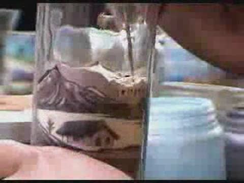 Minik bir şişenin içerisine renkli ince kum kullanarak tablo yapti...