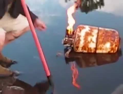 Suyun üzerinde yüzen tüpü ateşe verdiler ve o anları kameraya çektiler.
