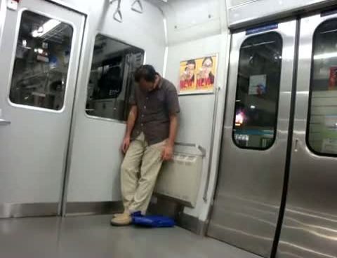 Metroda ayakta uyuyan adam öyle derin uyuyor ki izleyenler numara mı yapıyor yoksa gerçekten de uyuyor mu diye sormadan edemiyor.