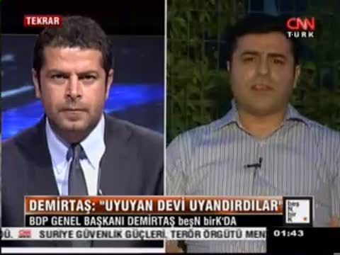 CNN Türk ekranlarında yayınlanan beşN birK'ya BDP Genel Başkanı Selahattin Demirtaş konuk oldu. Cüneyt Özdemir'İn sunduğu programda artan terör saldırılarını değerlendiren Demirtaş, çarpıcı açıklamalarda bulundu.Bir örgütün ben artık ateşkes ilan ediyorum, silahların bırakılması için bir diyalog ortamı arıyorum dediğinde akıllı bir devletin bu fırsatı çözüme dönüştürmesi gerektiğini dile getiren Demirtaş, "Bunu bir gurur meselesi, kan davası meselesi şeklinde ele alamaz bir devlet. Sonuçta Türkiye toplumunun tamamının yüreğini yakan ve annelerin 30 yıldır ağlamasına neden olan bir sorundan bahsediyoruz. Bakın siz son iki ayda 40 cenazeden söz ettiniz. Ben ekleyim bu cenaze sayısı 80'den fazladır. Niye, çünkü; bu kadar da PKK'lı yaşamını yitirmiştir. Türkiye toplumunda bunlar görülmüyor belki ama sonuçta bu insanlarında anneleri babaları bu ülkenin vatandaşları" ifadelerini kullandı.