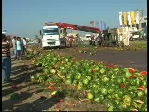 Mersin'in Tarsus ilçesinde bir otomobille kamyonun çarpışması sonucu 13 kişi yaralandı. Otomobilin hurda yığınına döndüğü kazada karpuz yüklü kamyon yan yattı.Araçta bulunan karpuzlar yol ortasına saçıldığı kazada kamyon alev almaya başladı.