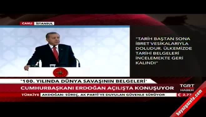Erdoğan konuşmasının başında Çanakkale zaferinin 100. yılı münasebetiyle yayınladığı mesajda dönemin Osmanlı hükümetini 'kukla' olmakla suçlayan HDP'ye yüklendi.