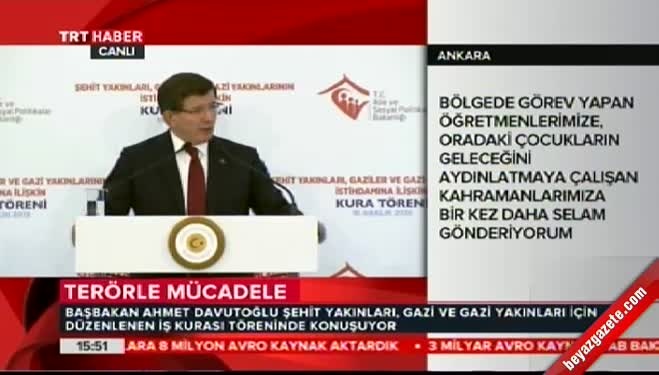 Şehit ve Gazi yakınlarına çekilen iş kurası töreninde konuşan Başbakan Ahmet Davutoğlu, HDP'nin hendek siyasetiyle seçmenine ihanet ettiğini söylereken 'Hendek, barikat siyasetinin medet umanlar. HDP Kobani'den sonra hendeklerle, barikatlarla kendisini varetmeye başlıyor. HDP kendisine oy veren vatandaşlarımıza dahi ihanet etmektedir. Bölgedeki seçmen onlara bir beklentiyle oyunu emanet etti. Onlar ise bu emanete açık bir şekilde ihanet etti. Bu partinin yetkililerine, terörü savunanlara sesleniyorum, aldığınız demokratik yetkiyi hendeklere boca ediyorsunuz. Bir yandan öğrencilerinden ayrıldığı için yürekleri sızlayanlar, diğer yanda ise bölge insanına eziyet edenler. HDP'li bir vekil, bir kadın siyasetçiye yakışmayacak üslupta twitter hesabında 'bırakın gitmeyeceksiniz, terketmeyeceksiniz, bir gün dönünce bulamayabilirsiniz'. Bu nasıl bir tehdittir. Sur'da, Cizre'de, Silopi'de bu vatanın her bir güzel köşesinde nerede terör var ise oradan bu terör odakları temizleninceye kadar kesinlikle mücadelemiz sürecektir. ' dedi. BaşbakanŞehitAhmet Davutoğlu
