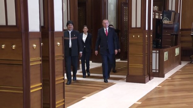 - Cumhurbaşkanı Recep Tayyip Erdoğan - Bolivya Devlet Başkanı Juan Evo Morales AymaBolivya Devlet Başkanı Morales Ankara 'da - Cumhurbaşkanı Recep Tayyip Erdoğan, Bolivya Devlet Başkanı Juan Evo Morales Ayma'yı resmi törenle karşıladıANKARA (AA) - Türkiye Cumhurbaşkanı Recep Tayyip Erdoğan, Bolivya Devlet Başkanı Juan Evo Morales Ayma'yı resmi törenle karşıladı.Konuk Devlet Başkanı Morales'in bulunduğu makam aracını Cumhurbaşkanlığı Külliyesi'nin önündeki caddede karşılayan süvariler, protokol kapısına kadar eşlik etti.Erdoğan, Morales'i Cumhurbaşkanlığı Külliyesi'nin ana giriş kapısında karşıladı.Erdoğan ve Morales'in tören alanındaki yerlerini almalarının ardından, 21 pare top atışı eşliğinde iki ülkenin milli marşları çalındı.Morales, Muhafız Alayı Tören Kıtası'nı, "Merhaba asker" diyerek selamladı. Törende, tarihte kurulan 16 Türk devletini temsil eden bayraklar ve askerler de yer aldı.İki ülke heyetlerinin takdimi sonrasında Erdoğan ve Morales, merdivenlerde Türkiye ve Bolivya bayrakları önünde gazetecilere poz verdi.Erdoğan ve Morales, baş başa ve heyetler arası gerçekleştirecekleri görüşmelerin ardından ortak basın toplantısı düzenleyecek.Törende, Dışişleri Bakanı Mevlüt Çavuşoğlu, Milli Eğitim Bakanı Ziya Selçuk, Cumhurbaşkanlığı İletişim Başkanı Fahrettin Altun ile Cumhurbaşkanlığı Sözcüsü İbrahim Kalın da yer aldı. İletişimResmi TörenBasın ToplantısıToplantıMakam Aracı