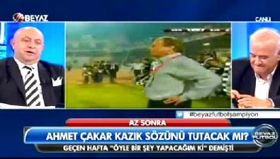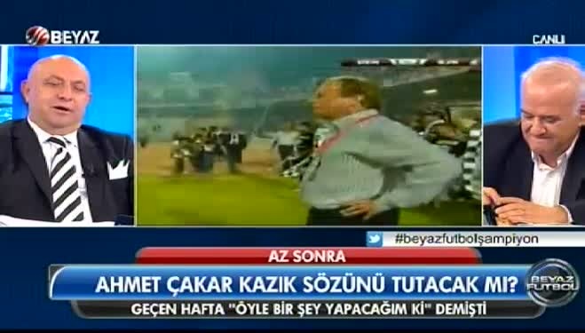 Daha önceki bir programda Beşiktaş'ın şampiyon olamayacağını, eğer olursa yağlı kazığa oturacağını söyleyen Ahmet Çakar dün siyah beyazlıların resmen şampiyon olmasının ardından Beşiktaşlı yorumcu Sinan Engin'in getirdiği kazıklı tişörtü giydi.