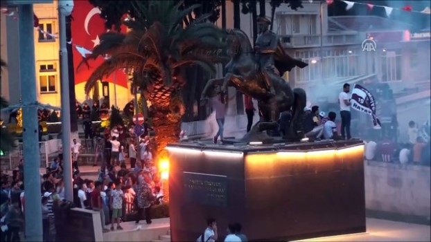 - - Şampiyonluk kutlamalarından detay görüntüler - Hatay Büyükşehir Belediye başkanı Lütfü Savaş'ın konuşması - TFF 2. Lig Kırmızı Grup'ta Afjet Afyonspor'u 2 - 0 yenerek 1. Lig'e yükselen Hatay spor'un şampiyonluğu, kentte coşkuyla kutlandıHATAY (AA) - TFF 2. Lig Kırmızı Grup'ta 34. ve son hafta maçında Afjet Afyonspor'u 2 - 0 yenen Hatay spor'un şampiyon olarak Spor Toto 1. Lig'e yükselmesi kentte sevinçle karşılandı. Hatay Büyükşehir Belediyesi tarafından Cumhuriyet alanında yapılan kutlamalarda bordo - beyazlı taraftarlar, büyük coşku yaşadı.Takım otobüsü meşale ve tezahüratlarla karşılayan taraftarlar, takımlarının 1. Lig'e çıkmasının mutluluğunu yaşadı.Alana kurulan sahneye tek tek çağrılan futbolcular, taraftarları selamladı ve özçekim yaptı. Temsili kupanın kaldırıldığı programda, havai fişek gösterisi de düzenlendi. Hatay Büyükşehir Belediye Başkanı Lütfü Savaş, burada yaptığı konuşmada, şampiyonluktan dolayı duyduğu mutluluğu dile getirerek emeği geçen herkese teşekkür etti.Şampiyonluğun, teknik heyet, yönetici, futbolcu ve taraftarın el birliği ile geldiğini belirten Savaş, "Hep birlikte başardık ve Hatay 'ı spor kenti yaptık." dedi. Önümüzdeki sezon Hatay spor'u daha çok güçlendireceklerini kaydeden Savaş, Süper Lig için adım atacaklarını vurguladı. Havai Fişek GösterisiŞampiyonTezahüratHavai FişekYükselen