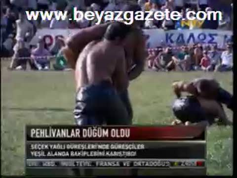 Yunanistan ' ın Evros kenti Seçek Yaylası ' nda düzenlenen yağlı güreşlerde yarı final mücadelesi yapan başpehlivanlar, gözleri yağdan ve terden iyi göremeyince, rakiplerini şaşırdı.
