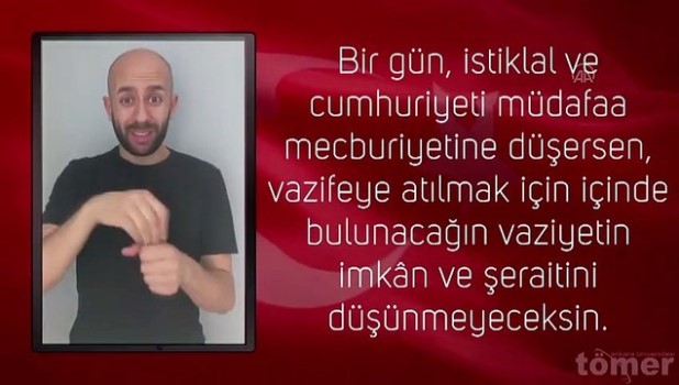 - Atatürk'ün Gençliğe Hitabesinin Türk işaret diliyle anlatıldığı videoAtatürk'ün Gençliğe Hitabesi Türk işaret diline çevrildi - Ankara Üniversitesi Türkçe ve Yabancı Dil Uygulama ve Araştırma Merkezince hazırlanan videoda Gazi Mustafa Kemal Atatürk'ün Gençliğe Hitabesi, işaret diliyle anlatıldıANKARA (AA) - Ankara Üniversitesi Türkçe ve Yabancı Dil Uygulama ve Araştırma Merkezi (TÖMER) Gazi Mustafa Kemal Atatürk'ün Gençliğe Hitabesi'ni, Türk işaret diline çevirdi. Ankara Üniversitesi Rektörü Prof. Dr. Erkan İbiş, Twitter hesabından yaptığı paylaşımda, "İlk kez Atatürk'ün Gençliğe Hitabesi tam metninin Türk işaret dili çevirisi Ankara Üniversitesi TÖMER'in işitme engelli hocalarınca yapıldı. Başarılı çalışmaya katkı verenlere ve emeği geçenlere teşekkür ediyorum." ifadesini kullandı.Prof. Dr. İbiş'in linkini paylaştığı videoda, Ankara Üniversitesi TÖMER İşaret Dili Programları Koordinatörlüğü görevlilerinin Gençliğe Hitabe'yi Türk işaret diline çevirerek anlattığı görülüyor. İşaret Diliİşitme EngelliNato