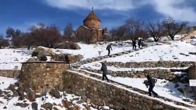 : - Akdamar İskelesi'nden genel detaylar - Akdamar Adası'na yolculuk - Adanın genel detayı - Adadan detaylar - Kiliseden detaylar - Ziyaretçilerle röportaj - Dönüş - Akdamar Adası ve üzerindeki kiliseden genel detayEkspres yolcuları Akdamar'a uğramadan dönmüyor - Van Gölü ve Doğu ekspresleriyle kente gelen turistler, bölgenin en önemli tarihi ve turistik değerlerinden Akdamar Adası ve adadaki kiliseyi ziyaret ediyor - İzmir'den Van 'a gelen Şükran Sayı: - "Bölgenin güzelliklerine hayran kaldım. Akdamar çok güzel. İnsanlar çok iyi, misafirperver ve samimi. Buraya yeniden gelmek isterim"VAN (AA) - Van Gölü ve Doğu ekspresleriyle bölgeye gelen turistler, Van 'ın en önemli turizm değerleri arasında bulunan Akdamar Adası ve adadaki Akdamar Kilisesi'ne uğramadan dönmüyor.Her yıl binlerce yerli ve yabancı turisti ağırlayan Akdamar Adası ve kilise, kar yağışının ardından oluşan beyaz görüntüsüyle ziyaretçileri hayran bırakıyor.İlkbaharda çiçek açan badem ağaçları, yazın gökyüzü ve Van Gölü'nün eşsiz maviliği, kışın da kar sonrası oluşan beyaz örtüsüyle ziyaretçilerin hafızasına yerleşen Akdamar Adası, son yağışlarla eşsiz bir güzelliğe büründü.Gevaş ilçesi sınırlarında yer alan ve Vaspurakan Kralı 1. Gagik tarafından 915 - 921 yıllarında yaptırılan Akdamar Adası'ndaki kilise, bembeyaz kar örtüsü, çevresini saran dağlar ve masmavi gökyüzüyle misafirlerini ağırlıyor.Fotoğraf sanatçılarının da en çok ziyaret ettiği mekanlar arasındaki Akdamar, Van Gölü ve Doğu ekspresleriyle bölgeye gelen ziyaretçilerin uğrak adresi oldu. - "Bölgenin güzelliklerine hayran kaldım"Doğu Ekspresi ile İstanbul'dan yola çıkan Taner ve Semra Antalya çifti, AA muhabirine, Van 'ın tarihi ve doğal güzelliklerini gezdiklerini belirtti.