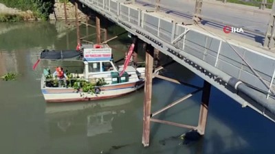 ( HATAY )- Temizleme teknesiyle şehir merkezinde bulunan köprü direklerine takılan sümbüller toplanıyor HATAY