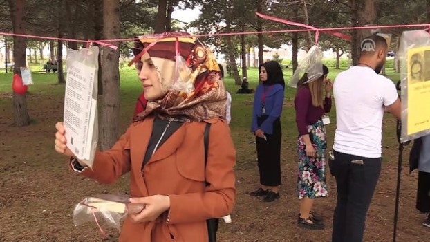 "Kampüste Ağaçlar Kitap Açtı" - ERZURUM - Projenin gerçekleştiği alandan görüntü - Ağaçlarda asılı olan kitaplar - Vatandaşlar tarafından kitapların incelenmesi - Fakültenin Halkla İlişkiler ve Tanıtım Bölümü 1. sınıf öğrencisi Serpil Aksakal'ın açıklaması"Kampüste Ağaçlar Kitap Açtı" - Erzurum Atatürk Üniversitesi öğrencileri, kitap okumayı yaygınlaştırmak amacıyla yaklaşık bin 500 kitabı kampüsteki ağaçlara astıERZURUM (AA) - Erzurum Atatürk Üniversitesi öğrencileri, "Kampüste Ağaçlar Kitap Açtı" sloganıyla, ağaçlara yaklaşık bin 500 kitap astı.Üniversitenin İletişim Fakültesi Halkla İlişkiler ve Tanıtım Bölümü öğrencileri, kitap okumayı yaygınlaştırmak ve kitap bilinci oluşturmak amacıyla başlattıkları proje çerçevesinde, Rektörlük binası yakınındaki Kortlar bölgesinde bulunan ağaçlara iplerle bağladıkları kitapları asıp çevredekilerin beğenisine sundu.Bu uygulama ilgisini çekenler de ders, roman, hikaye gibi farklı konulardaki birçok kitabı ipinden çözüp ücretsiz alma fırsatı buldu.Fakültenin Halkla İlişkiler ve Tanıtım Bölümü 1. sınıf öğrencisi Serpil Aksakal, AA muhabirine yaptığı açıklamada, sosyal sorumluluk projesi kapsamında böyle bir uygulama gerçekleştirdiklerini söyledi.