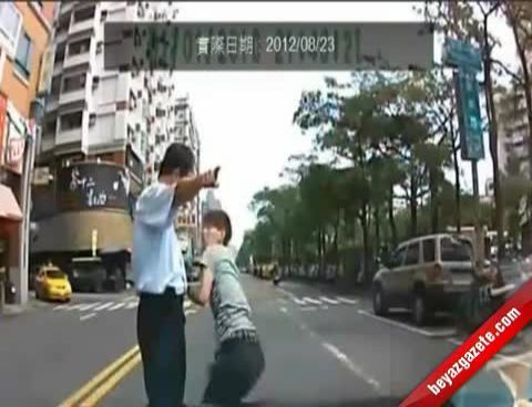 Ana yolda koşarak gelen genç kendini duran bir arabanın önüne attı. Olayın şokunu atlatan şoför arabadan inerek çocuğun yanına gitti. Araç sahibi çocuğa eğer yerden kalkmazsa polisi arayacağını söyleyince genç ayağa kalktı. Görüntüler aracın iç kamerasından kaydedildi.