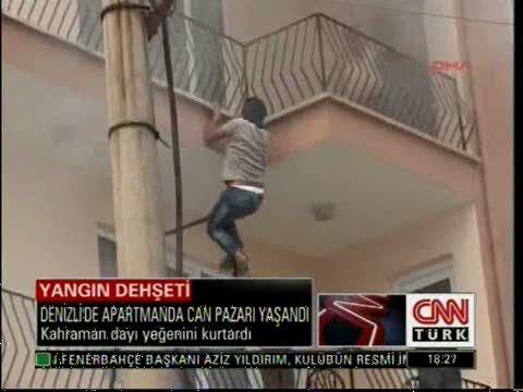 Denizli'de bir binada çıkan yangında mahsur kalan bir aylık bebek, balkon demirlerinden 5. kata tırmanan bir kişi, tarafından kurtarıldı. Yangında dumandan etkilenen 7 kişi de hastaneye kaldırıldı.