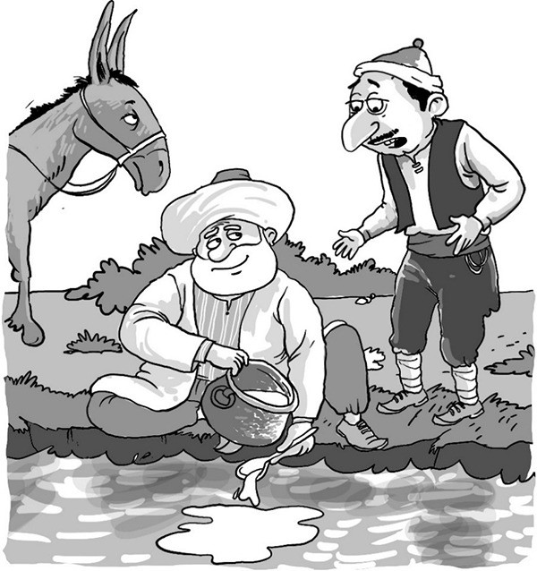 Nasrettin hoca elindeki yoğurt bakracını yıkamakla meşgul. Bakracın içinde kalmış yoğurtlar da suya biraz karışınca su orada beyazlamış. Hoca bakmış ki karşısındaki Temel. Asırlar sürecek rekabetin müsebbibi. Fırsat bu fırsattır deyip Temel ile dalgasını geçmiş: