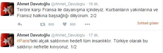 Başbakan Ahmet Davutoğlu, Paris’teki terör saldırılarını sert biçimde kınadı, Fransa’ya başsağlığı diledi.