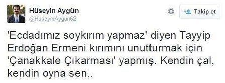 Aygün yaşanan olayları, Cumhurbaşkanı Recep Tayyip Erdoğan'a bağlayarak, "Ecdadımız soykırım yapmaz diyen Tayyip Erdoğan Ermeni kırımını unutturmak için 'Çanakkale Çıkarması' yapmış. Kendin çal, kendin oyna sen" yorumunda bulunarak bir skandala imza attı.