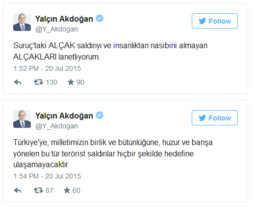 Başbakan Yardımcısı Yalçın Akdoğan Twitter'dan Şanlıufra Suruç'taki patlamaya ilişkin değerlendirmelerde bulundu. Akdoğan, “Suruç'taki alçak saldırıyı ve insanlıktan nasibini almayan alçakları lanetliyorum” ifadelerini kullandı.