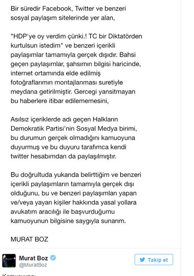 Bu doğrultuda yukarıda belirttiğim ve benzeri içerikli paylaşımların tamamıyla gerçek dışı olduğunu, bu ve benzeri paylaşımları yapan ve/veya yayan kişiler hakkında yasal yollara avukatım aracılığı ile başvurduğumu kamuoyunun bilgisine saygıyla sunarım' notunu paylaştı.