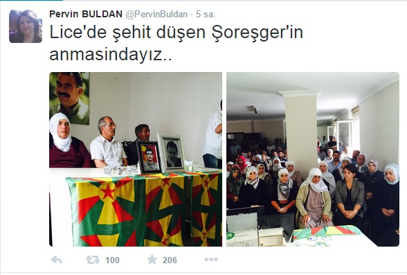 Ailesine başsağlığı dileyen Pervin Buldan, Twitter hesabından 'Lice'de şehit düşen Şoreşger'in anmasındayız' ifadeleriyle ziyaretini takipçileriyle paylaştı.