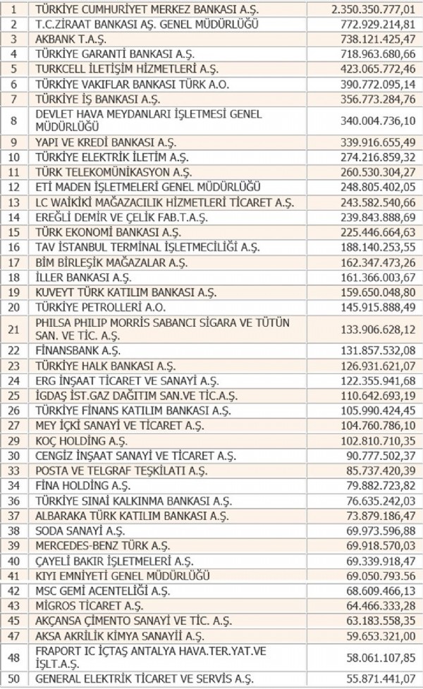 2014'te söz konusu listenin zirvesinde bulunan Ziraat Bankası, geçen yıl 772 milyon 929 bin 214,81 lira ile ikinci sırada yer aldı. Akbank ise 738 milyon 121 bin 425,47 lira ile üçüncü oldu.