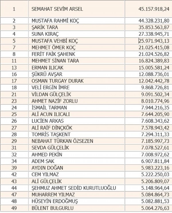 Arsel'i, 44 milyon 328 bin 231,80 lira vergi tahakkuk ettirilen Mustafa Rahmi Koç izledi. Arsel ve Koç'u, 35 milyon 853 bin 563,87 lira vergi tahakkuk ettirilen Şarık Tara takip etti. 2014 yılının vergi rekortmeni Tara, geçen yıl üçüncü sırada yer aldı.