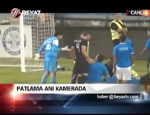 Tam o sırada futbolcu ve sağlık ekiplerinin arasına atılan bir madde gürültüyle patladı. Sakat olan oyuncu, 2 sağlık ekibi ve ayaktaki bir futbolcu kulaklarını tutarak yere yığıldı. Yaşananlar an be an görüntülendi.Hakem maça 10 dakika ara verdi. Tribünlerin sakin olmasına yönelik yapılan anonsların ardından karşılaşma kaldığı yerden devam etti. Yaralıların durumlarının iyi olduğu öğrenildi.