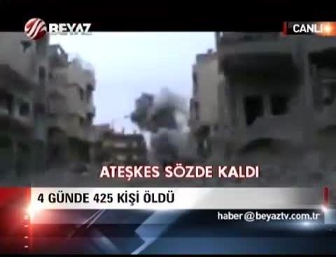 BM ve Arap Birliği'nin Suriye Özel Temsilcisi El Ahdar El İbrahimi'nin aracılığı ile Suriyeli muhaliflerle Esad rejimi arasında yapılan ve Kurban Bayramı boyunca sürmesi gereken sözde ateşkesin ilk 3 gününde en az 300 kişi öldü. Suriye'de Cuma günü başlayan bayramın ilk gününde 150, ikinci gününde 120, dün de en az 30 kişinin öldüğü bildirildi. Esad güçlerinin dün Şam'ın doğusundaki Sünni mahalleler Erben, Harasta ve Zamalka'yı savaş uçaklarıyla bombaladığı bildirildi. Şam ile Halep arasındaki Maret El Numan'da haftalardır süren çatışmaların bayramda da hız kesmeden devam ettiği belirtildi. Ancak Suriye'de siyasi çözümden umudunu kesmeyen İbrahimi'nin, Kasım başında BM Güvenlik Konseyi'ne yeni bir teklifle gelmeye hazırlandığı bildirildi. İbrahimi'nin önümüzdeki günlerde Çin ve Rusya'ya gideceği ve muhaliflerle Esad arasında bir anlaşma için zemin arayacağı belirtildi.