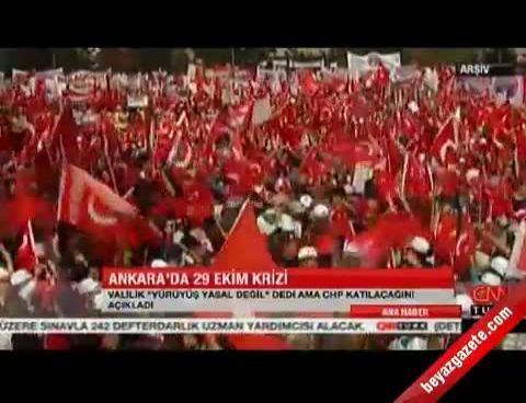 Ankara Valiliği, 20 'den fazla demokratik kitle örgütünün 29 Ekim Cumhuriyet Bayramı 'nda Meclis 'ten Anıtkabir 'e yapmayı planladığı yürüyüşten sonra, Ulus 'taki Birinci Meclis önünde yapılacak alternatif kutlamaya da izin vermeyeceğini duyurdu. Eylemi organize edenler ile katılanlar hakkında gerekli yasal işlemin yapılacağı ifade edildi. 29 Ekim 'de Anıtkabir 'e yürüyüşe izin verilmeyince kitle örgütleri bu kez alternatif Cumhuriyet Bayramı kutlaması çerçevesinde, 'Seferberlik Yürüyüşü ve Vatan ve Cumhuriyet için Halk Buluşması ' adı altında yeni bir yürüyüş organize edip çağrı yapmıştı. CHP Genel Başkan Yardımcısı Umut Oran da, “O Cumhuriyet mitingi yapılacak” demişti. Ankara Valiliği, dün, Birinci Meclis önünde yapılacak bu gösteriye izin verilmeyeceğini açıkladı.