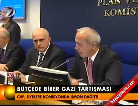 CHP İstanbul Milletvekili Mevlüt Aslanoğlu, limonlu protesto yaptı. Aslanoğlu, duvara "Emniyet Genel Müdürlüğü bütçesinde biber gazı ödeneğine son" yazılı dövizler astı.