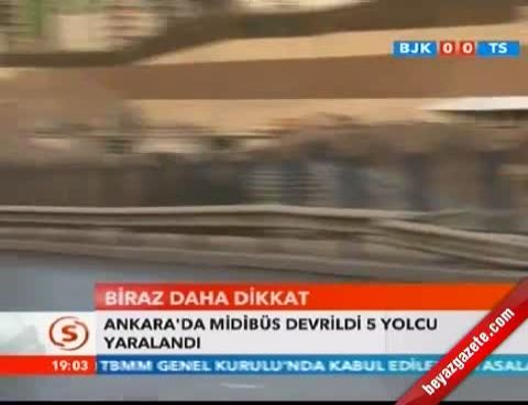 Olay, Esenboğa yolu Şenyuva rampalarında meydana geldi. Faruk Özdemir’in kullandığı 06 AGN 92 plakalı midibüs, Ulus istikametine giderken Şenyuva rampalarını indiği sırada yağan yağmurla kayganlaşan yolda direksiyon hakimiyetini kaybetti. Hakimiyeti kaybolan midibüs, yan bariyerlere çarptı. Midibüs kendi çevresinde üç tur döndükten sonra tekrar yol kenarında bulunan bariyerlere çarparak yan devrildi. Midibüs’te bulunan yolculardan Hüseyin Börek, Oğuzhan Bedir, Namık Oğulcan, Olcay Aydınlı ve Osman Arslan yaralandı. Kaza sonrasında olay yerine sağlık ekipleri, polis ve itfaiye çağrıldı. Yapılan ilk müdahalenin ardından yaralılar çevrede bulunan hastanelere kaldırıldı. Midibüsten yara almadan kurtulan yolcular ise yoldan geçen diğer otobüslerle yollarına devam etti .