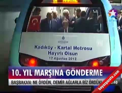 Kadıköy-Kartal Metrosu'nun açılış töreninde bir konuşma yapan Başbakan Tayyip Erdoğan şunları söyledi: "Yaklaşık 7 yıllık bir süreç oldu. 3.1 milyar liralık finansmanla, 22 km uzunluğundaki hattı tamamlıyoruz. Bu hatta 2.5 dakikada bir araç hareket etmesiyle farklı bir zenginlik geliyor. Bu süre zamanla daha da kısalacak. 90 saniyede bir Kadıköy'den Kartal'a araç hareket edecek. Anadolu Yakası'ndaki ilk metro hattının teknolojik altyapısı devrim niteliğinde. Trenlerde makinist olmayacak. Kumanda merkezindeki operatör mouse hareketiyle trenleri yönlendirecek.