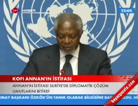 Bugün Cenevre’de aniden yapılan basın toplantısında konuşan BM ve Arap Birliği Suriye Özel Temsilcisi Kofi Annan, görevini 31 Ağustos tarihi itibari ile bıraktığını belirterek, “Suriye halkının çaresizce eyleme ihtiyacı varken, Güvenlik Konseyi’nde hâlâ birileri suçlanıyor ve isim takılıyor. Benim ya da bir başkasının Suriye hükümetini ya da muhalefeti siyasi süreçle alakalı adım atmaya zorlaması imkânsız. Özel temsilci olarak barışı asıl taraflardan, Güvenlik Konseyi’nden ya da uluslararası toplumdan fazla isteyemem” dedi.