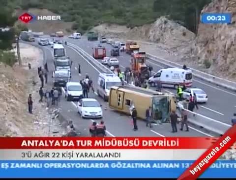 Geziden dönen tur midibüsünün Antalya-Korkuteli karayolunda devrilmesi sonucu meydana gelen kazada yaralanan 20 turistten biri hayatını kaybetti.