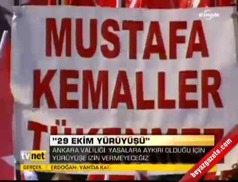 Ankara Valiliği, 20 'den fazla demokratik kitle örgütünün 29 Ekim Cumhuriyet Bayramı 'nda Meclis 'ten Anıtkabir 'e yapmayı planladığı yürüyüşten sonra, Ulus 'taki Birinci Meclis önünde yapılacak alternatif kutlamaya da izin vermeyeceğini duyurdu. Eylemi organize edenler ile katılanlar hakkında gerekli yasal işlemin yapılacağı ifade edildi. 29 Ekim 'de Anıtkabir 'e yürüyüşe izin verilmeyince kitle örgütleri bu kez alternatif Cumhuriyet Bayramı kutlaması çerçevesinde, 'Seferberlik Yürüyüşü ve Vatan ve Cumhuriyet için Halk Buluşması ' adı altında yeni bir yürüyüş organize edip çağrı yapmıştı. CHP Genel Başkan Yardımcısı Umut Oran da, “O Cumhuriyet mitingi yapılacak” demişti. Ankara Valiliği, dün, Birinci Meclis önünde yapılacak bu gösteriye izin verilmeyeceğini açıkladı.