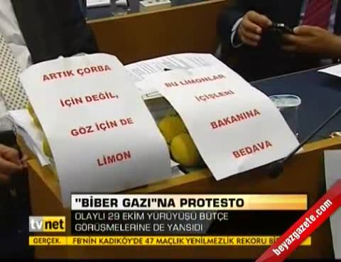 CHP İstanbul Milletvekili Mevlüt Aslanoğlu, limonlu protesto yaptı. Aslanoğlu, duvara "Emniyet Genel Müdürlüğü bütçesinde biber gazı ödeneğine son" yazılı dövizler astı.