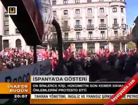 En büyük gösterilere sahne olan başkent Madrid'de şehir merkezini dolduran binlerce kişi, bankaları ve tüm siyasi partileri sert dille protesto ederek, genel grev çağrısında bulundu.
