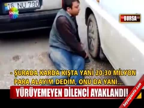 Bursa ' nın Osmangazi ilçesinde bulunan Reyhan pazarında gezen ekipler boynunda para kumbarası ile yerde sürünen bir dilenci gördü. Dilencinin yanına giden ekipler ile arasında kısa diyaloglar yaşandı. “Bu soğukta 20-30 lira para almak için geldim onu da burnumdan getirdiniz” diyen dilenci, ayağa kalkmakta direndi.