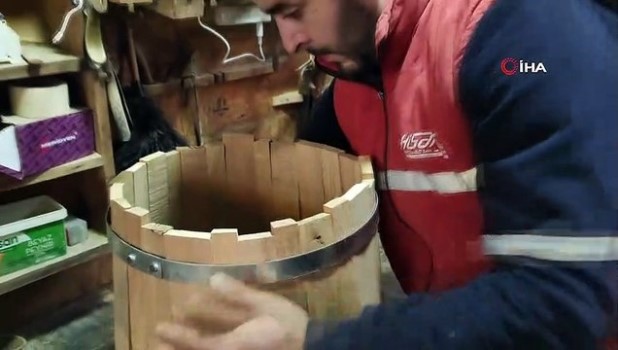 ( BURSA -ÖZEL)- 74 yıldır fıçı imal eden 88 yaşındaki İsmail Alkış, taburcu olunca soluğu atölyesinde aldı BURSA