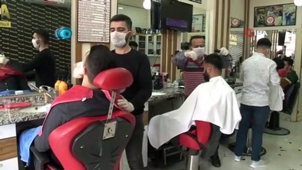 - Adana’da bir berber ve çalışanları korona virüs tedbirleri kapsamında maske ve eldiven takıp, tıraş yapmaya başladı.