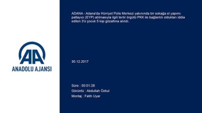 Operasyonda, terör örgütü PKK ile bağlantıları bulunduğu ve olaya karıştığı ileri sürülen H.K. (14), M.N.A. (18), R.B. (12), K.E. (17) ve V.B. (18) yakalandı.Gözaltına alınarak Adana Adli Tıp Biriminde sağlık kontrolünden geçirilen zanlılar, ifade işlemleri için İl Emniyet Müdürlüğüne götürüldü. Şüphelilerden H.K, R.B. ve K.E'nin, Çocuk Şube Müdürlüğü ekiplerine teslim edildiği öğrenildi. - Olay güvenlik kamerasındaÖte yandan, olay anına ilişkin güvenlik kamerası görüntüleri ortaya çıktı.Polis merkezinin güvenlik kamerası kayıtlarında, EYP'nin bir kişi tarafından sokağa atıldığı ancak patlamadığı, daha sonra başka bir şüphelinin bunu alıp götürdükten sonra patlayıcının infilak ettiği görülüyor.Hürriyet Polis Merkezi yakınındaki bir sokakta 28 Aralık'ta küçük çaplı patlama meydana gelmiş, olayda ölen ya da yaralanan olmamıştı.