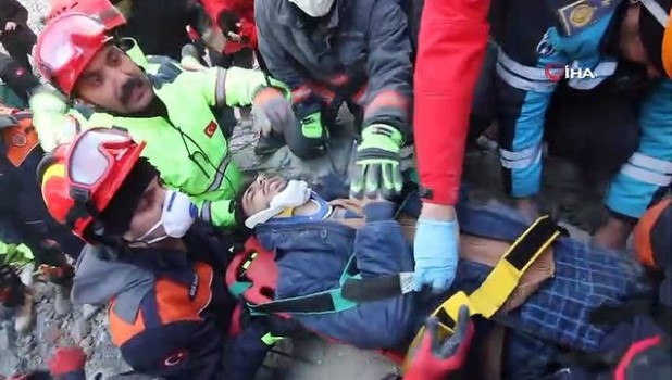 - Elazığ'da meydana gelen 6.8 büyüklüğündeki depremde görev alan Erzurum AFAD personelleri 17 saat sonra enkaz altından kurtardıkları Çelik ailesini hastanede ziyaret etti. Merkez üssü Elazığ Sivrice olan 6.8 büyüklüğündeki depremden hemen sonra bölgeye giden Erzurum AFAD ekibi, Mustafapaşa Mahallesi'nde yıkılan Yıldız apartmanında görev yaptı. Apartmanın birinci katında yaşayan ve enkaz altında kalan Azize (45)-Cengiz Çelik(48) çifti ile oğulları Muhamet Faruk (24) ve Ahmet'i (18) kurtarmak için ekipler seferber oldu. Evin başka bir bölümünde enkaz altında kalan anne Azize Çelik için jandarma ekipleri alarma geçerken, baba ile 2 oğlu için Erzurum AFAD yoğun bir çaba gösterdi. Çalışma neticesinde baba ve oğullarını sağ bir şekilde kurtaran AFAD personelleri kurtarma çalışmalarının bitmesinin ardından Çelik ailesini hastanede ziyaret ederek geçmiş olsun dileklerinde bulundular. Çelik ailesi ise kendilerini kurtaran AFAD personellerine teşekkür etti. (ST-)