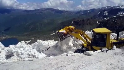 - İş makinasının karlı alanda yol açma çalışması - İl Özel İdaresi ekipleri, Bayburt - Trabzon arasındaki 2 bin 700 rakımlı yayla yollarında karla mücadele çalışması yürütülüyorBAYBURT (AA) - Bayburt 'ta haziran ayında yayla yollarında karla mücadele çalışması yapılıyor.İl Özel İdaresi Konursu Şantiye Şefi Dursun Ali Barın idaresindeki ekip, iş makinesiyle Bayburt - Trabzon arasında "Yedi Göller" bölgesi olarak bilinen 2 bin 700 rakımlı Haldizen Yaylası yolunda, yüksekliği yer yer 4 metreyi bulan karı temizlemek için çalışma başlattı.Karla mücadele ekibi, kışın yoğun kar nedeniyle ulaşıma kapanan, yaz aylarında özellikle doğa tutkunlarının uğrak yeri olan Soğanlı Dağları'nın dik yamaçları arasındaki Aygır Gölü, Balıklı Göl, Dipsiz Göl, İkiz Göller, Kara Göl, Sarıçiçek Gölü ile Pirömer Gölü'nün yer aldığı güzergahın açılması için çalışmalarını aralıksız sürdürüyor.Çalışmaların, yarın bitirilmesi planlanıyor."Yedi Göller" bölgesi, yeşil ve mavinin eşsiz tonları, serin sularıyla son yıllarda şehrin stres ve gürültüsünden uzak, doğayla baş başa vakit geçirmek isteyen yerli ve yabancı turistlerden ilgi görüyor. Güzergahİş MakinesiYabancı TuristHaziran AyıKarla Mücadele