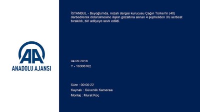 - Güvenlik kamerası görüntüleriBeyoğlu'ndaki cinayet - Çağın Türker'in darbedilerek öldürülmesine ilişkin gözaltına alınan 4 şüpheliden 1'i adliyeye sevk edildiİSTANBUL (AA) - Beyoğlu'nda, mizah dergisi kurucusu Çağın Türker'in (40) darbedilerek öldürülmesine ilişkin gözaltına alınan 4 şüpheliden 3'ü serbest bırakıldı, biri adliyeye sevk edildi.Asayiş Şube Müdürlüğü Cinayet Büro Amirliği ekiplerince, Türker'in başına aldığı yumruk darbesi sonucu hayatını kaybetmesine ilişkin gözaltına alınan 4 şüphelinin işlemleri tamamlandı.Şüphelilerin emniyetteki ifadesinde, bir arkadaşlarının evlilik öncesi kutlama yemeği yedikleri restoranda otururken, yan masadaki Türker ile kız arkadaşı D.E'nin de eğlencelerine dahil olduğunu, sohbet sırasında argo konuştuğu iddia edilen Türker'in uyarıldığını söylediği öğrenildi.Bir süre sonra masadan ayrılan Türker'in cep telefonunu unuttuğu için yeniden restorana döndüğü ve masadakilere, "Telefonumu unutmuşum, niye haber vermiyorsunuz? Siz de az değilmişsiniz." dediğini öne süren şüphelilerden Yusuf Ş. (30) ifadesinde, restorandan ayrılırken, "Bütün gece bize küfür etti." diyerek Türker'e yumruk attığını ve daha sonra olay yerinden ayrıldıklarını anlattı.Gözaltına alınan şüphelilerden F.Ü, F.B. ve O.D. savcılık talimatıyla emniyetten serbest bırakıldı. Türker'e yumruk atarak ölümüne sebebiyet verdiği iddiasıyla gözaltına alınan Yusuf Ş. emniyetteki işlemlerinin ardından adliyeye sevk edildi.Yusuf Ş. emniyetten adliyeye götürülürken basın mensuplarına, "Pişmanım." dedi. Fermeneciler Caddesi'ndeki bir restoranda 2 Eylül'de, yumruk darbesiyle yaralanan Türker, kız arkadaşının ihbarı üzerine kaldırıldığı Şişli'deki özel hastanede yapılan müdahaleye rağmen kurtarılamamıştı. Kız ArkadaşCep TelefonuAvcılıkCinayetBasın Mensupları